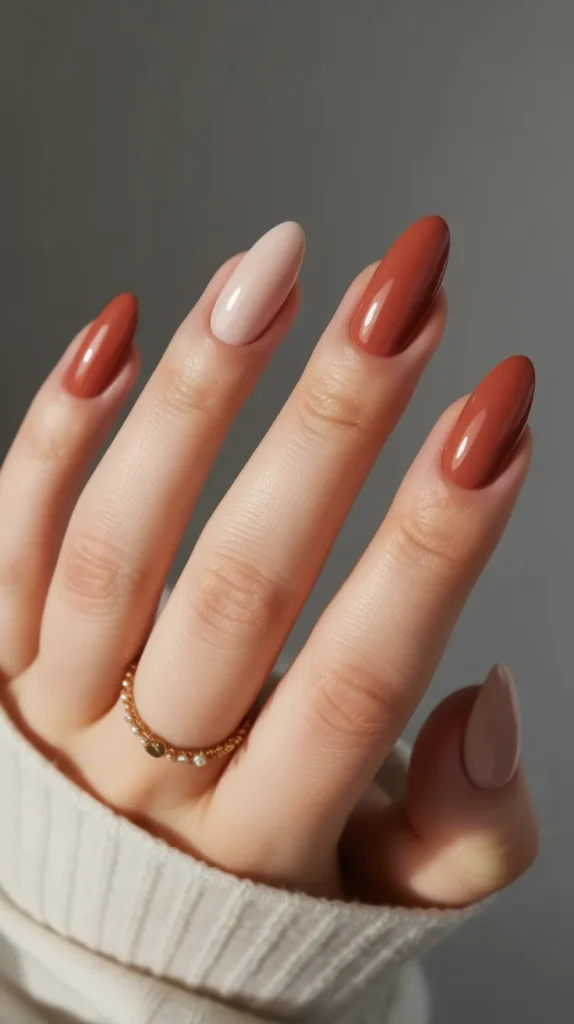 Think pottery-inspired vibes but on your nails. Terracotta paired with creamy neutral shades feels earthy, cozy, and effortlessly stylish.