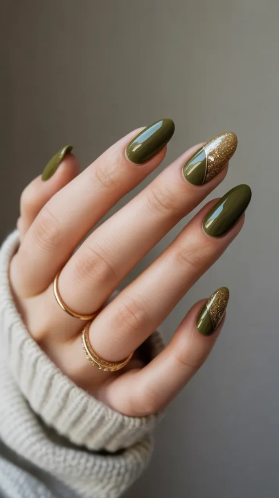 Olive nails get a little glow-up with subtle gold glitter accents. It’s like cozy meets glam—perfect for early fall nights out.