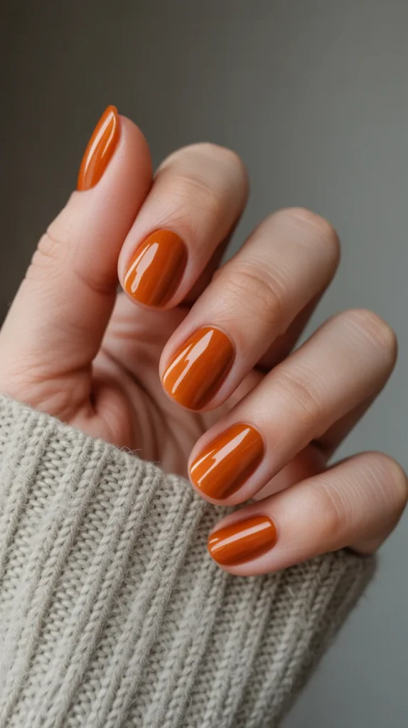Burnt orange is basically the poster child for fall nail colors. 🎃 These glossy easy autumn nails feel festive without being complicated. Perfect for when you want instant seasonal vibes with minimal effort.