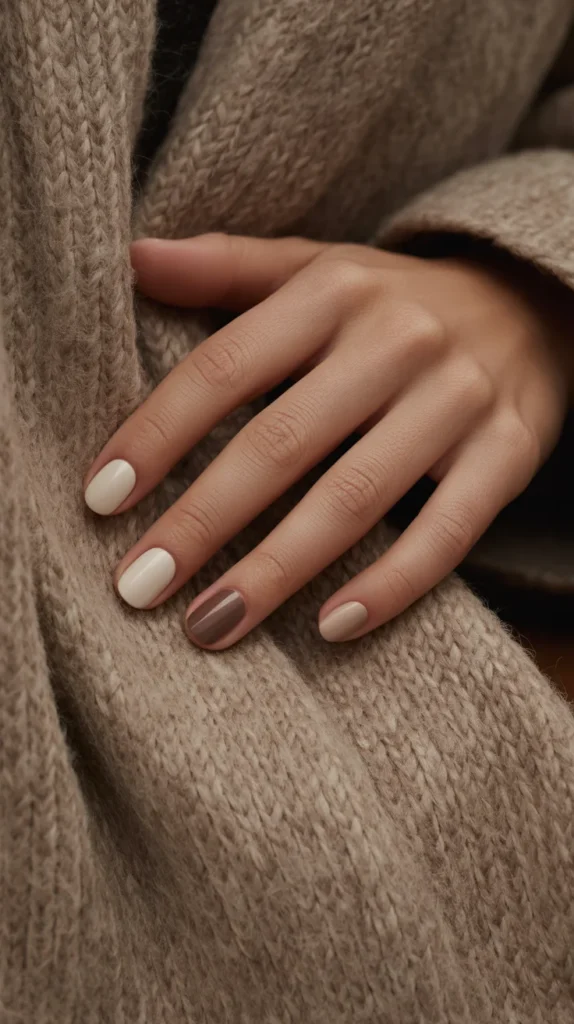 Cream, taupe, and brown nails mixed across both hands create an earthy palette. 🪵 These harvest nails feel creative without being fussy. Perfect if you love variety but want to keep it minimal.
