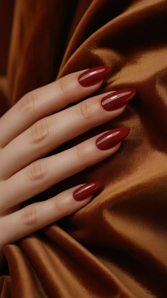 Cranberry red always makes a statement in autumn. 🍷 Glossy and bold, these fall nails bring seasonal drama while still being easy to pull off. They’re perfect for casual wear or festive nights.