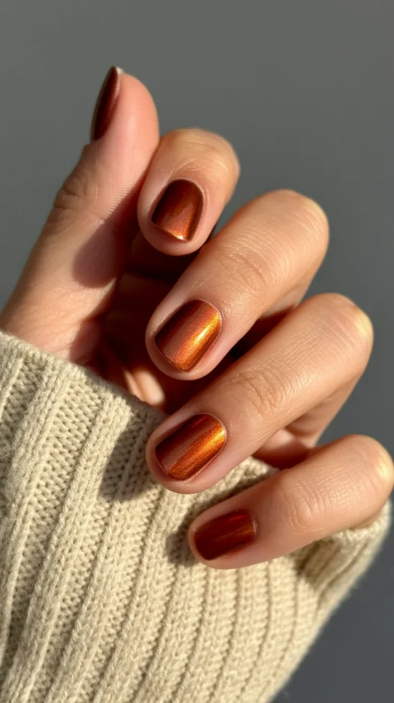 Shiny copper nails glow like autumn sunsets. 🌅 They’re bold but still practical as easy autumn nails. Perfect for adding warmth and shine to your seasonal style.