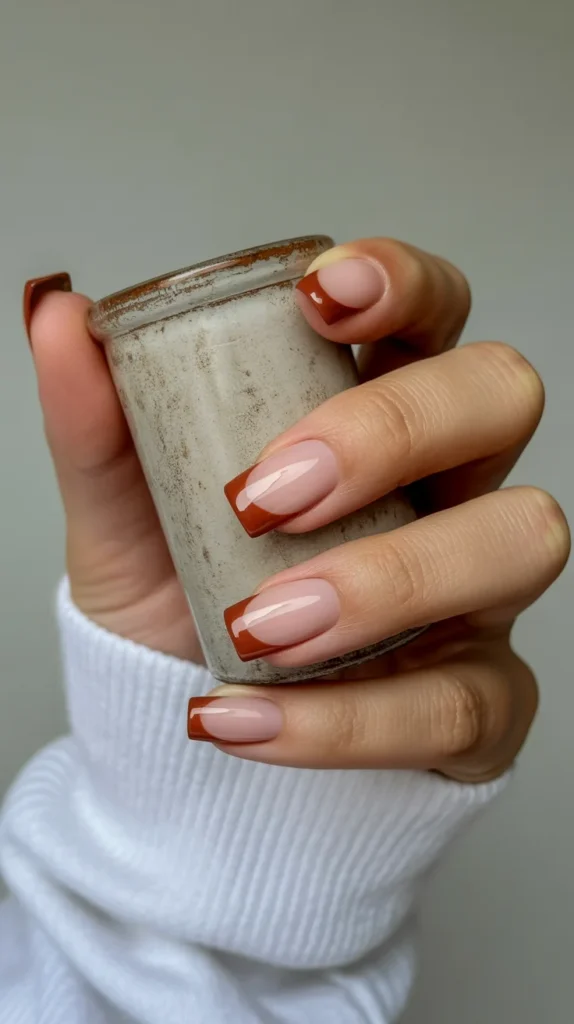 Nude nails with terracotta tips? Total seasonal twist. 🍂 These easy autumn nails keep things minimal but still give autumn energy. A subtle way to freshen up French tips.