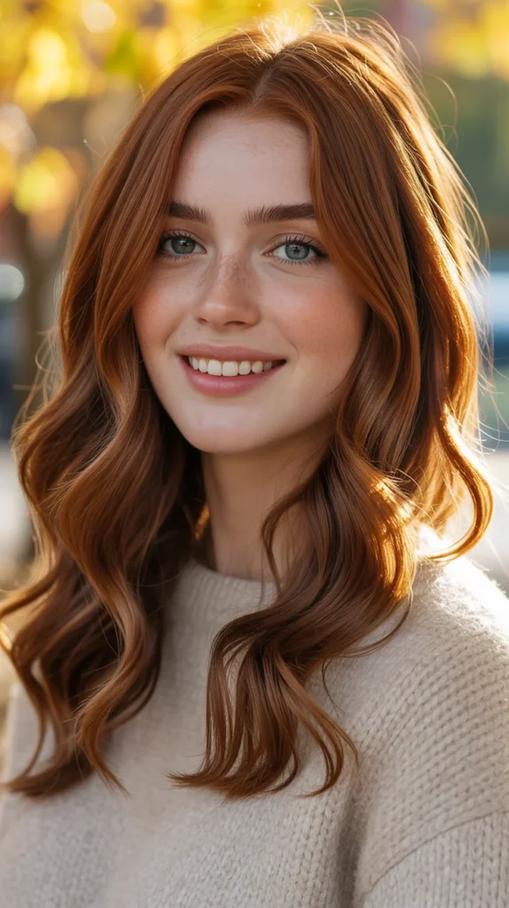 Auburn always shines in the fall, and loose waves make it even better. 🍂 This deep red shade glows under autumn light, creating a cozy yet polished finish. The warmth of auburn pairs perfectly with seasonal outfits, from chunky knits to tailored coats. On wavy hair, the tone catches dimension beautifully, adding softness and charm. It’s timeless, chic, and the ultimate fall hair color if you’re after glow and depth.