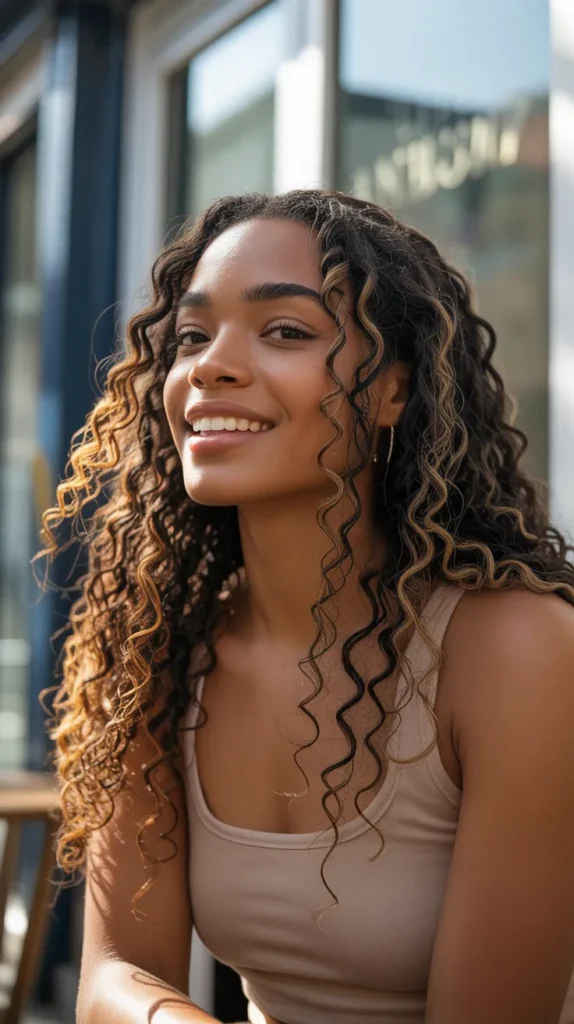 Honey blonde highlights bring golden light into layered brunette hair 🌼. On dark skin, the warm blonde tones glow beautifully and make every feature stand out. It’s one of the best fall hair colors for Black women who want brightness without losing depth. Honey tones feel chic yet playful, perfect for both casual days and glam nights. Add waves for even more dimension, and you’ve got autumn-ready hair.