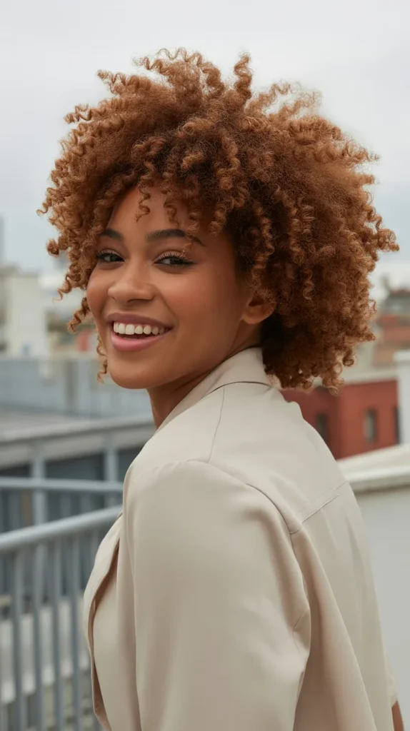 A copper-toned afro is pure autumn vibes 🔥. The bold copper shade lights up curls and gives your look so much energy. This fall hair color for Black women radiates warmth and highlights the beauty of natural texture. It’s perfect if you want a head-turning style that still feels seasonal and chic. Imagine your afro glowing under golden fall sunlight total statement moment.