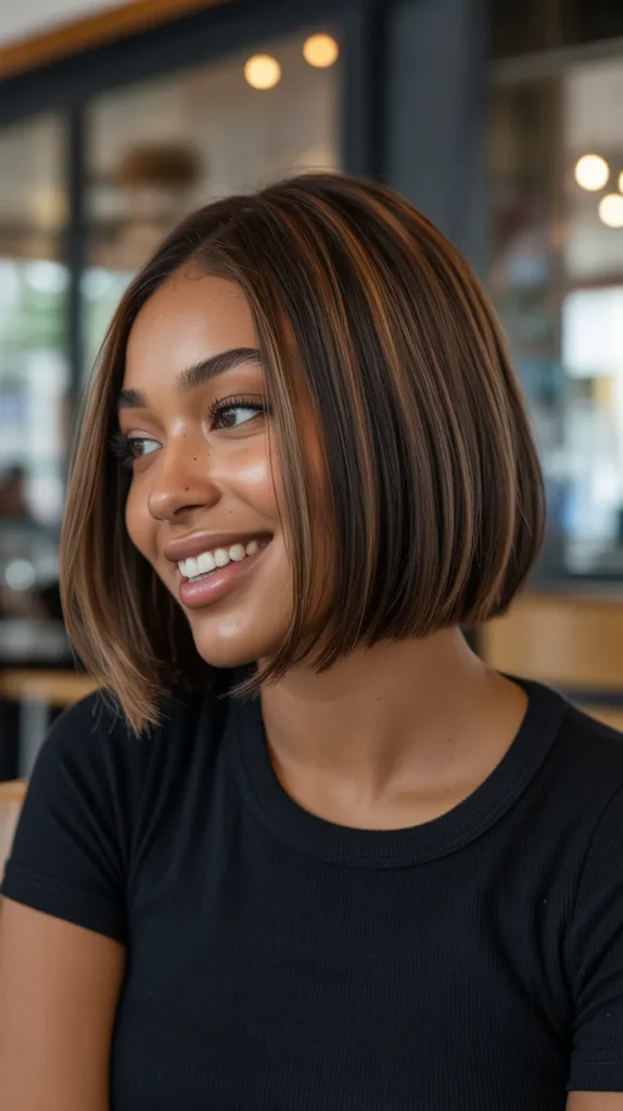 Chocolate balayage on a short bob is a total fall refresh 🍫. The rich brunette shade with balayage highlights adds softness and depth without being overwhelming. On dark skin, this fall hair color looks chic and timeless. It’s also low-maintenance because the balayage grows out beautifully. If you want a bob with personality, chocolate balayage nails it.