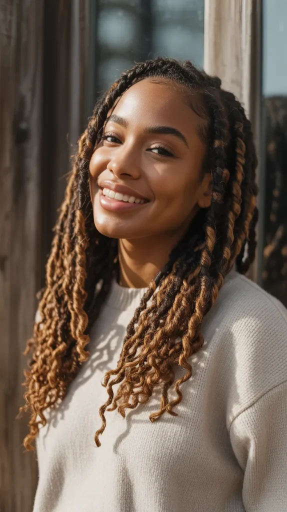 Copper blonde locs glow like autumn leaves 🍁. The warm tones woven into long locs bring instant seasonal vibes. This fall hair color for Black women feels bold, radiant, and totally chic. It’s the perfect choice if you love protective styles that still make a statement. Copper blonde streaks against dark skin create a glow that feels magical.