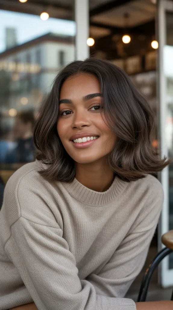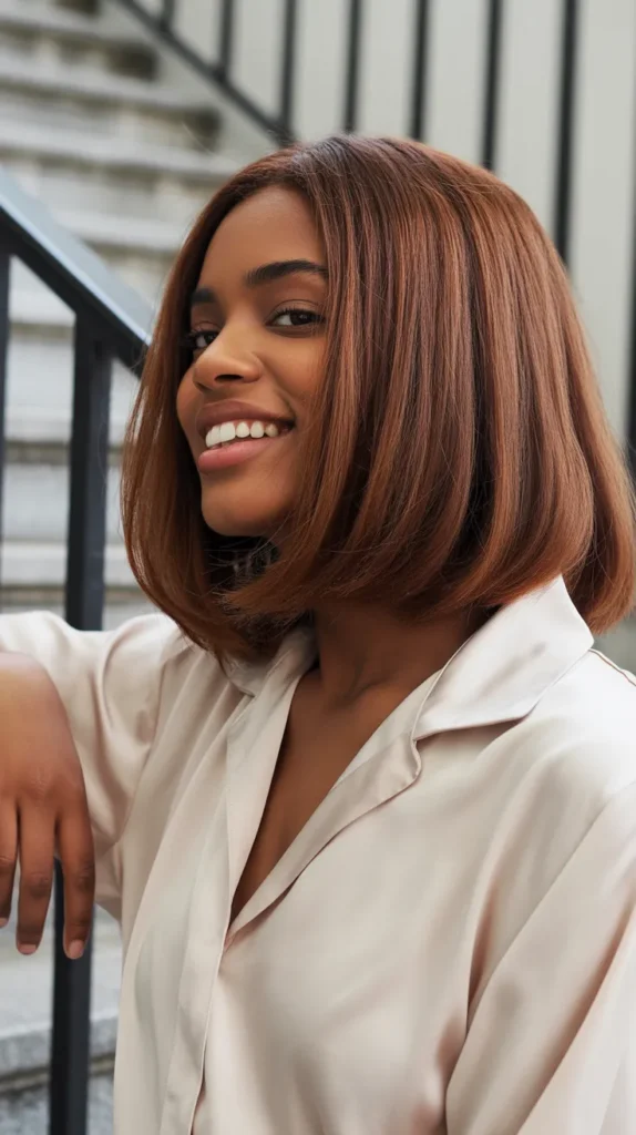 The chestnut brunette lob is a soft and elegant option for fall 🍂. The shoulder-length cut keeps it modern, while chestnut tones add warmth to your look. It’s subtle but still chic the kind of fall hair color for dark skin that works for every occasion. Pair it with sleek straight styling or gentle waves, and it looks effortlessly polished. Chestnut always brings that cozy autumn energy.
