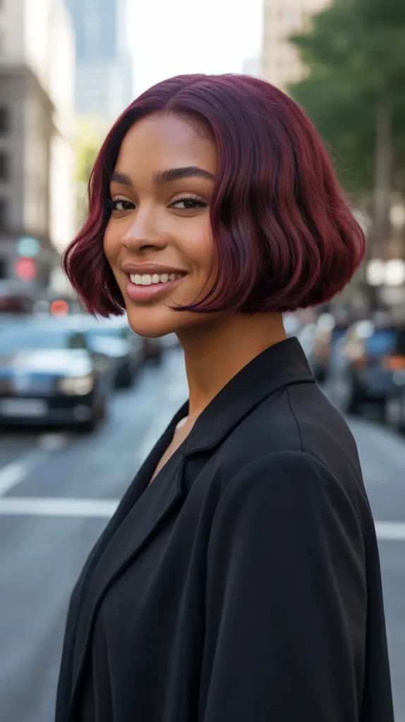 A sleek burgundy bob is bold, sophisticated, and totally fall-approved 🍷. The rich color gives depth while the chin-length cut keeps it modern and sharp. Burgundy is one of those fall hair colors for Black women that never goes out of style. It makes dark skin pop and brings a chic vibe that’s both powerful and polished. Honestly, this bob is the definition of looking chic without trying too hard.