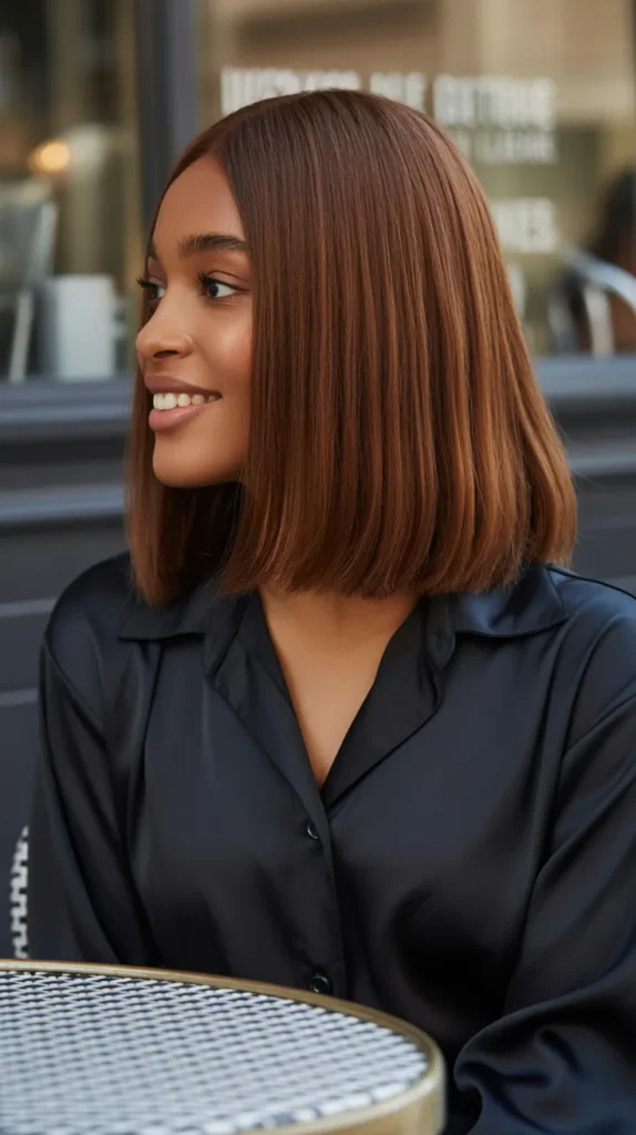 Walnut brown sleek hair gives understated elegance. The walnut shade adds depth and subtle dimension, perfect for autumn chic vibes 🌰. Straight, mid-length hair in this tone looks polished and modern without being too loud. It’s one of those fall hair colors for Black women that feels classy for any setting from work to weekend outings. If you love minimal but chic styles, this one’s for you.