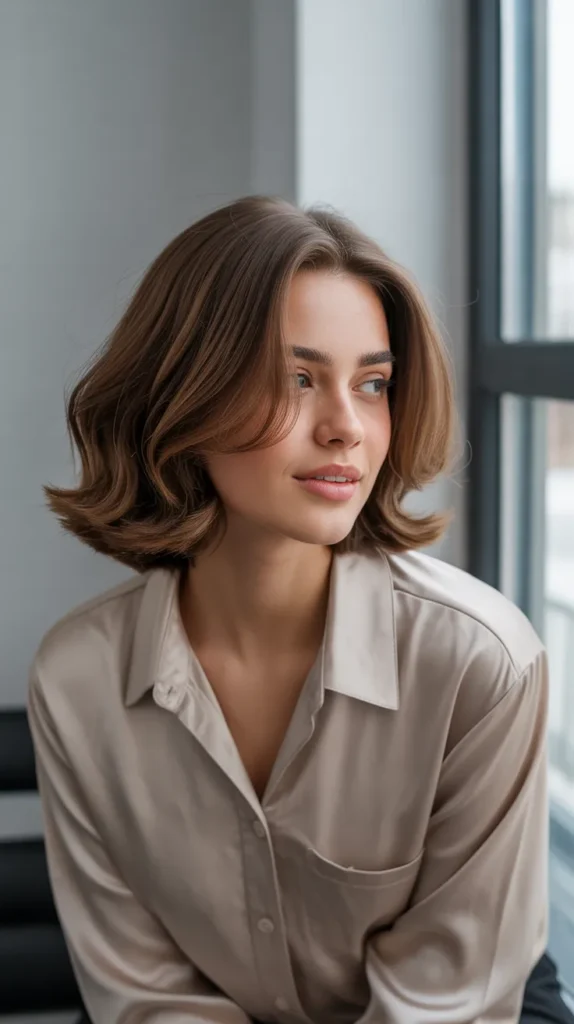 Want chic and polished? The espresso gloss bob delivers. This chin-length cut in deep espresso brunette gives instant sophistication, like “I just walked out of the salon” energy 💇♀️. The glossy finish makes your hair shine under fall sunlight, and honestly, it’s hard not to feel bossy with this cut. Pair it with bold lipstick or a cozy turtleneck, and you’re basically ready for anything. Who said short fall hair styles can’t make a big statement?