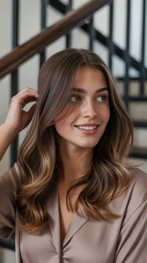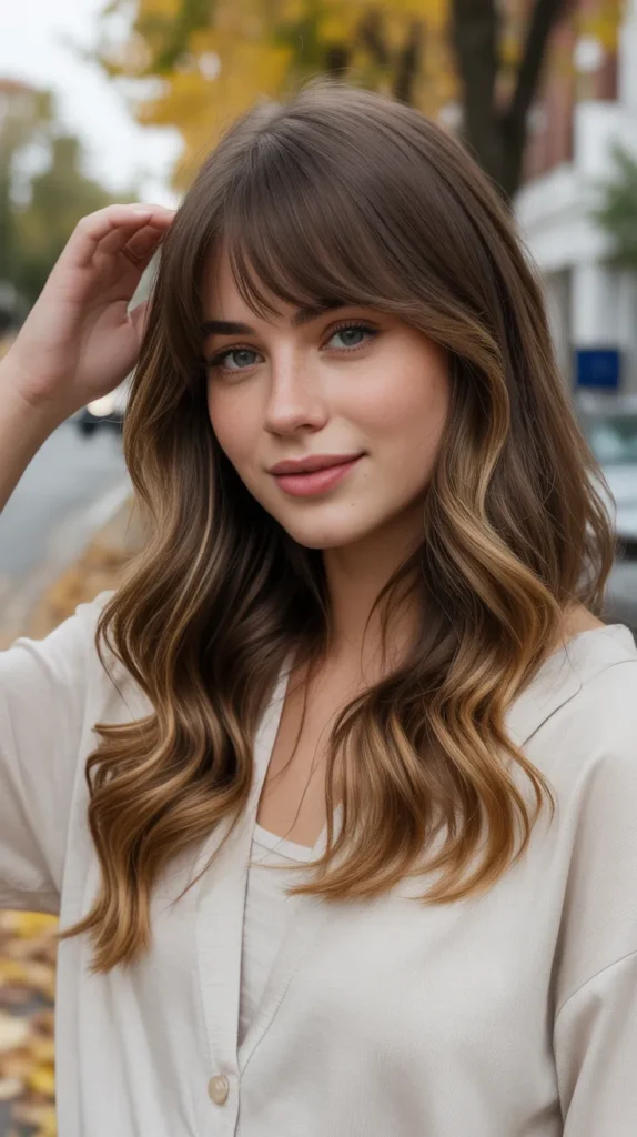 Caramel ribbons through brunette hair? Yes, please 😍. This style blends soft caramel tones into long brunette waves, giving that cozy fall hair glow we all want. It’s basically like wrapping your strands in a pumpkin-spice latte vibe warm, sweet, and perfect for the season. IMO, this look works great if you want to keep your brunette hair color natural but still add dimension. Picture yourself sipping coffee on a crisp morning, and your hair catching the light with every turn. That’s the magic of caramel ribbon balayage.