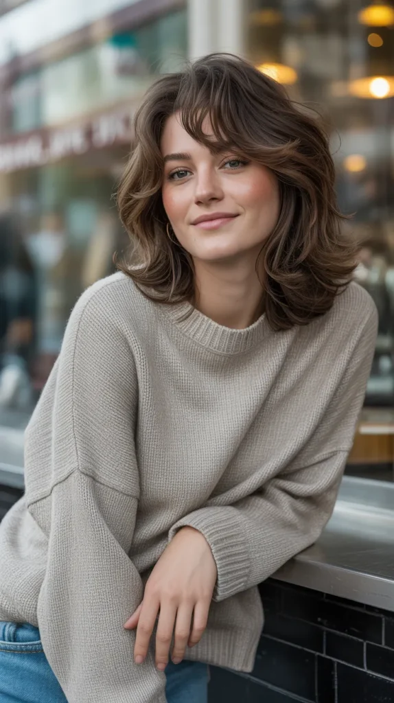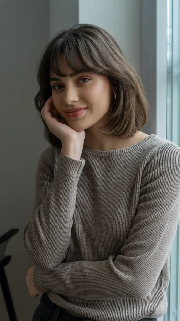 Curtain bangs are having a serious moment right now, and I’m not mad about it. On medium-length brunette hair, they frame your face like they were made for you 👏. The flowing cut works with waves, straight hair, or even a messy bun. They add movement without taking away from your natural brunette hair color. Plus, FYI they make every outfit look just a little more “put together,” even on lazy days.