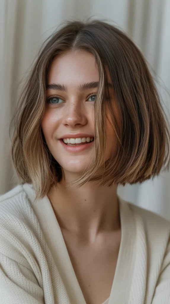 Short hair gets a seasonal glow-up with honeyed brunette balayage. A chin-length bob feels fresh and modern, while the honey tones brighten the brunette base. π― The balayage keeps it low maintenance while adding depth and dimension. The cut frames the face perfectly, making it one of the most wearable cute hair trends this season. Itβs sweet, chic, and perfect for fall.