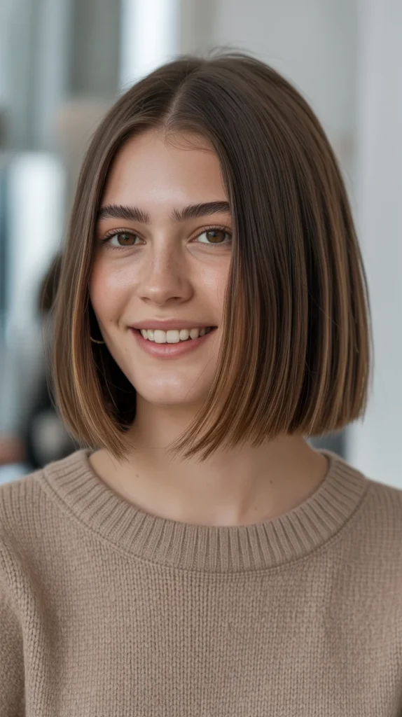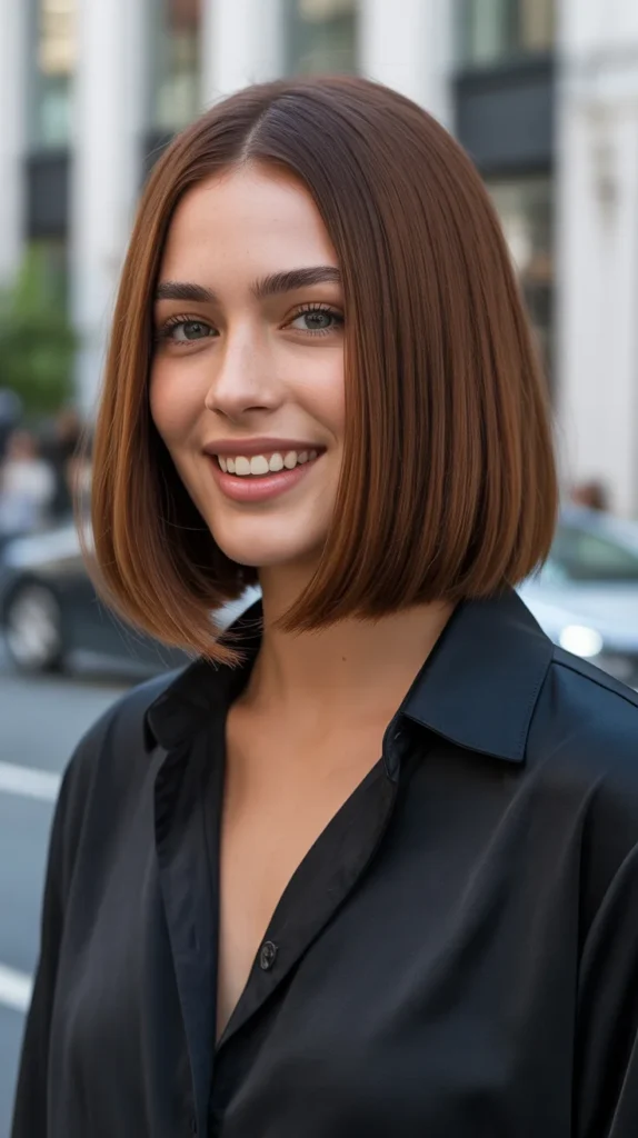 Chestnut brown is one of those fall hair colors for brunettes that never goes out of style. The warm, rich shade feels timeless and versatile, especially when paired with a blunt straight lob. π©βπ¦° It gives that polished βI tried without really tryingβ vibe. The chestnut tone adds enough depth to make the hair look fuller and shinier while still being low maintenance. Itβs sleek, chic, and ideal for both office wear and casual days.