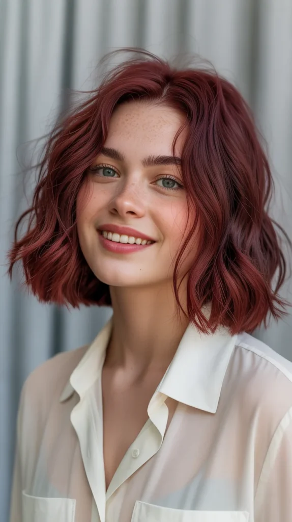 Wine red is a bold shade that feels luxe and season-appropriate. On a shoulder-length lob with soft waves, the color shines with depth and personality. π· Itβs daring but still wearable, perfect for anyone who wants to make a statement. The waves soften the richness of the red, making it flirty and fun. This cute hair trend proves bold color can also feel sophisticated.