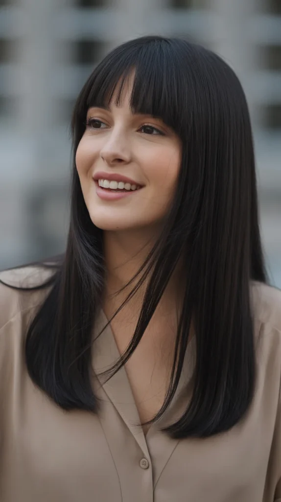 Jet-black hair is timeless, but adding curtain bangs gives it a softer autumn twist. On long, straight locks, the glossy black shade looks sleek and dramatic while the bangs frame the face with gentle charm. π€ Itβs chic, moody, and the perfect dark option for the season. The shine makes the black pop, giving it a healthy, glassy finish. For those craving bold fall hair, this is an unbeatable classic.