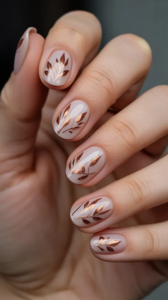 If sparkle makes you happy, this oneβs for you. A nude gel base topped with fine copper and gold glitter leaves gives your nails a festive edge without going full holiday mode.