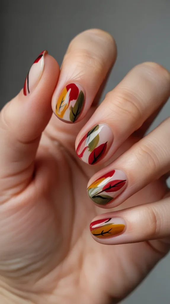 Not into realistic designs? Try abstract strokes of red, mustard, and olive to form artsy leaf silhouettes. Itβs trendy, bold, and feels more like wearable art than just nail polish.