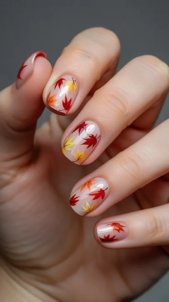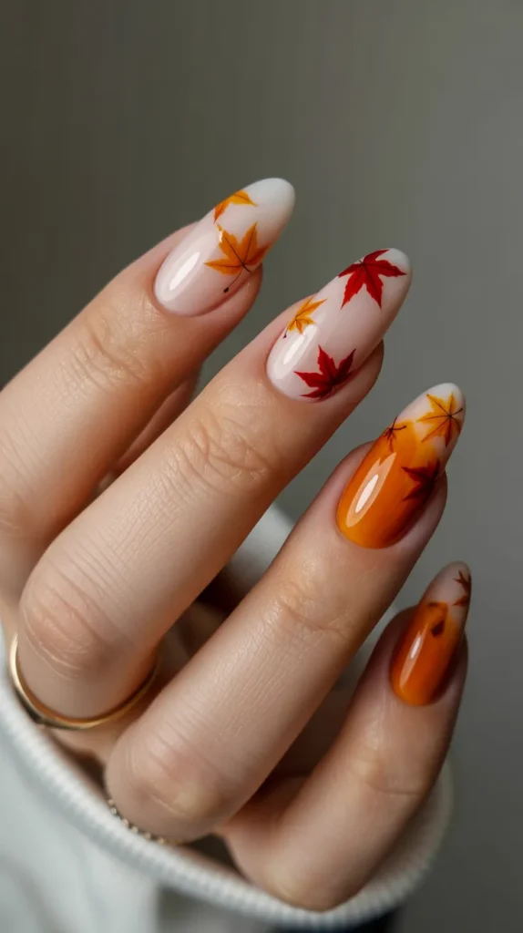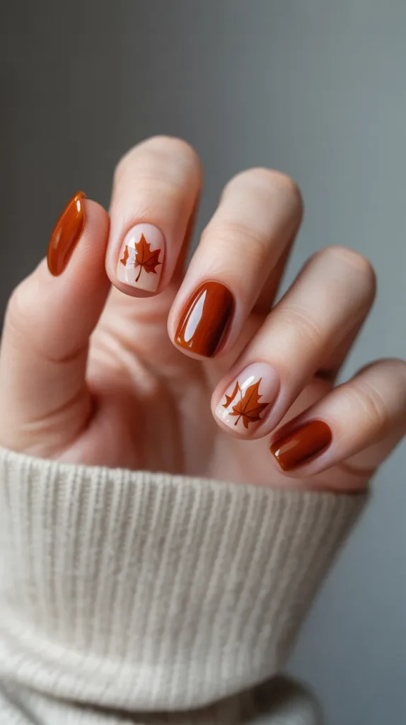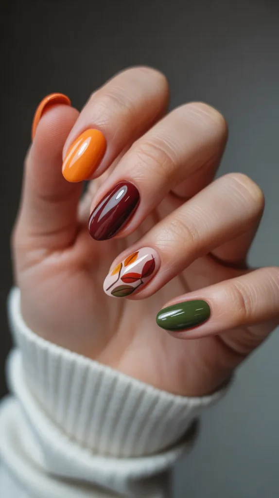 Hereβs a fun twist paint one hand with orange leaves and the other with burgundy and green. The mismatched look feels playful and makes your nails pop without needing extra bling.