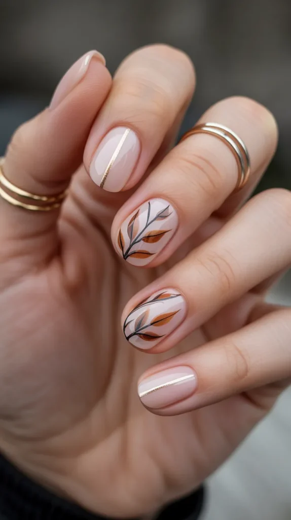 This design blends fine gold fall line nails with delicate painted leaves. Itβs the perfect mix of modern chic and seasonal detailβgreat for workdays that turn into date nights.