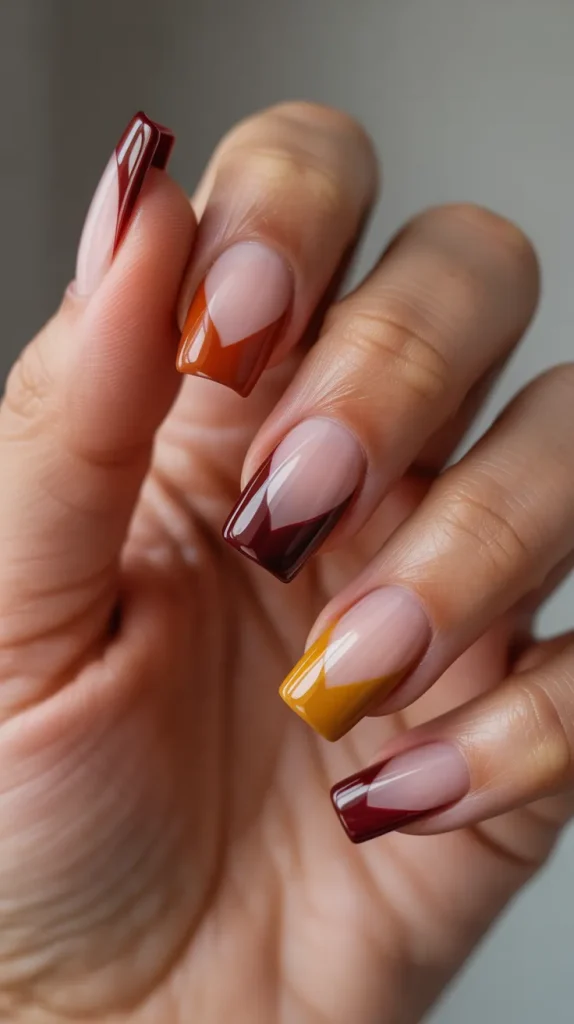 French tips, but letβs make them autumn. Instead of plain white, try tips in burgundy, mustard yellow, and burnt orange. These fall acrylic nails give you cozy pumpkin patch vibes that pair perfectly with chunky knits.