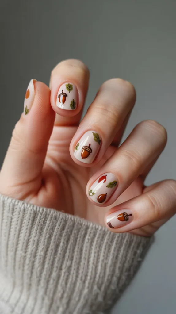 Want playful but still chic? Go for short nails with tiny acorns and scattered mini leaves over a beige base. It feels whimsical, seasonal, and just the right amount of fun.