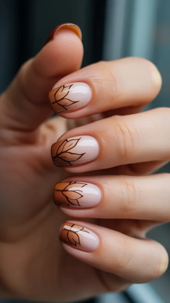 This oneβs for ombre fans. A soft fade from nude to brown sets the background for layered maple leaf outlines. Itβs chic, minimal, and still gives you that autumn detail without feeling overdone.
