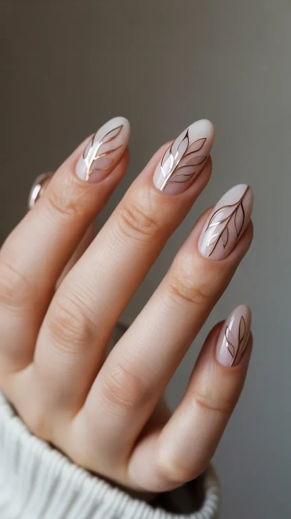Less is more with this style. A beige base plus thin metallic leaf outlines creates a sleek art deco nails vibe. Perfect if you love minimalist designs with a hint of shine.