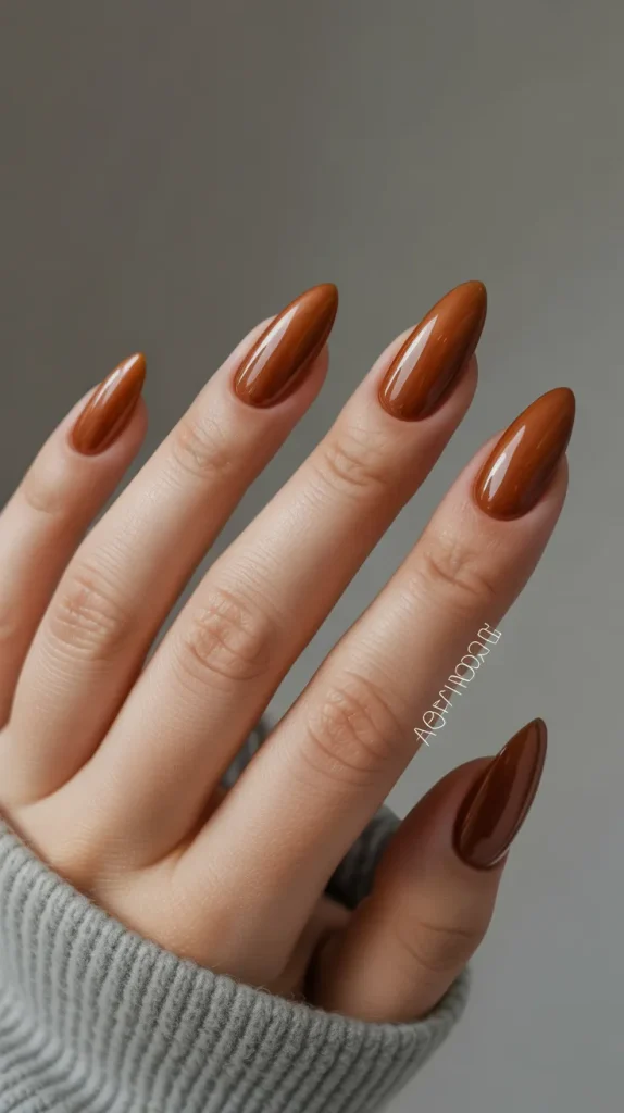 Glossy caramel-brown almond nails catch the autumn light in the prettiest way. The shade feels warm and refined, perfect for coffee dates or late-afternoon fall strolls. If you want elegant nails that glow without going over the top, this one is a must.