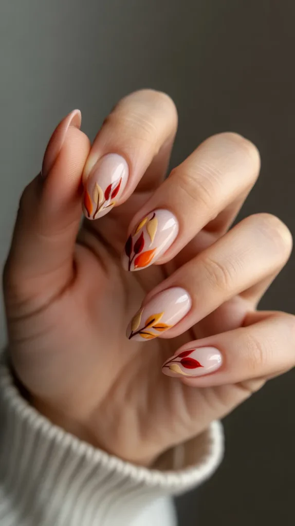 Hand-painted autumn leaves on nude almond nails? Talk about fall perfection. Orange, red, and gold details make your manicure feel like a mini piece of seasonal art. These fall nail inspo almond looks will get you compliments everywhere.