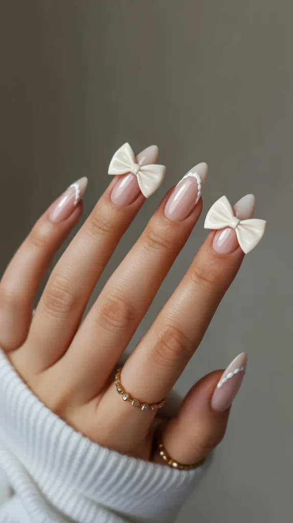 If you like your nails a little more whimsical, go for nude almond nails with delicate white bows. It’s feminine, classy, and has just enough personality to stand out. Honestly, it’s giving “soft girl autumn.”