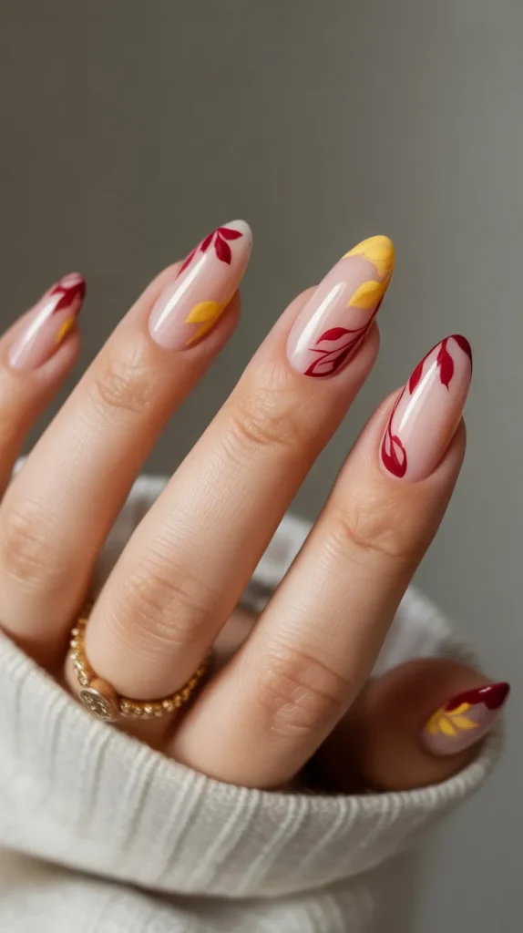 Delicate florals in warm red and yellow tones bring a softer side to fall nails. They look especially stunning against a nude or beige almond base. Think of them as the perfect mix between summer blooms and autumn vibes.
