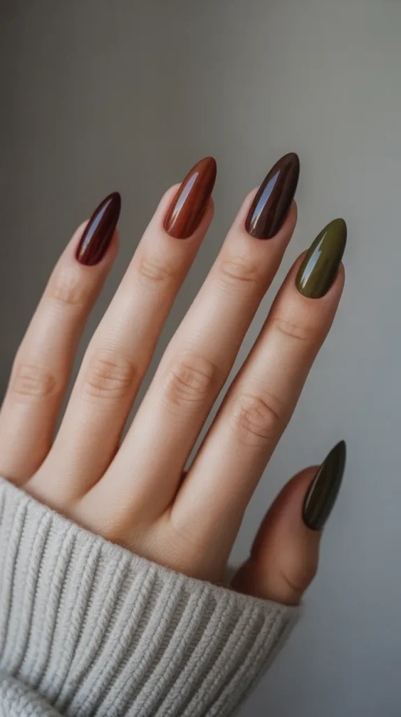 Why settle for one shade when you can have three? Alternating burgundy, chocolate brown, and olive green on almond nails creates a bold, rich look. It’s cozy, stylish, and basically a fall color palette on your fingertips.