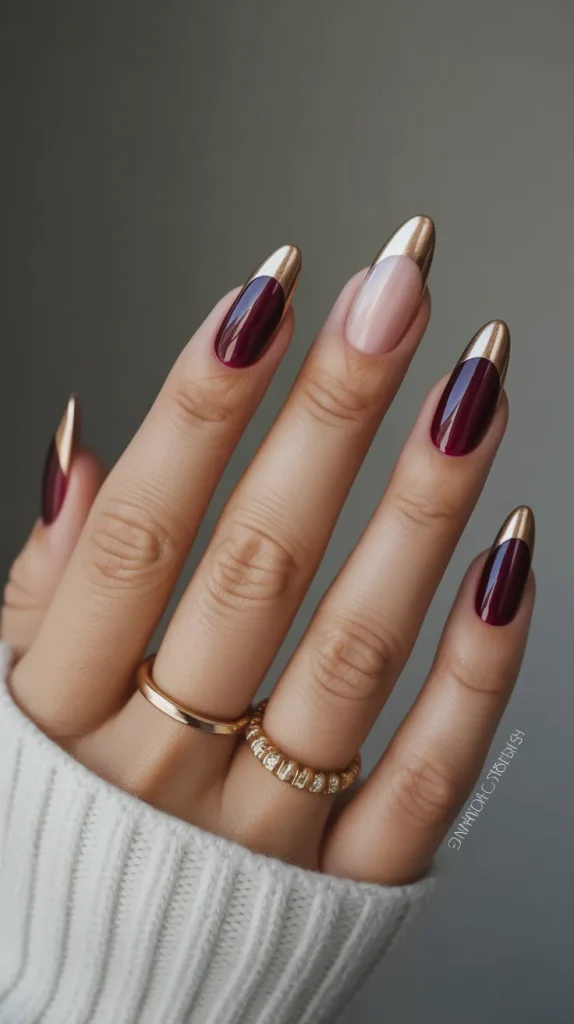 Plum almond nails with metallic gold tips are pure luxe. The combo feels dramatic yet wearable, making it perfect for fall nights out. These elegant nails are guaranteed to get noticed.