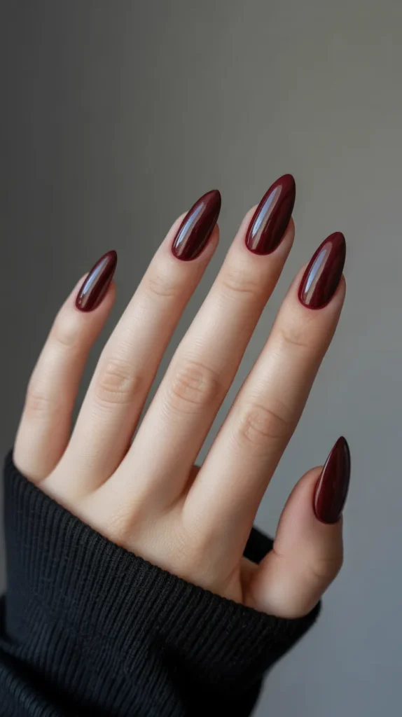 Deep burgundy almond nails are basically fall drama in manicure form. They stand out without being too flashy and pair perfectly with gold jewelry or cozy knit scarves. IMO, they’re the ultimate statement elegant nails for the season.