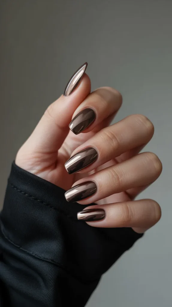 A chic twist on the classic almond, this style blends square tips with a mocha chrome finish. The result? Nails that feel modern, edgy, and refined all at once. It’s a fall nail inspo almond look that feels straight out of a glossy magazine.