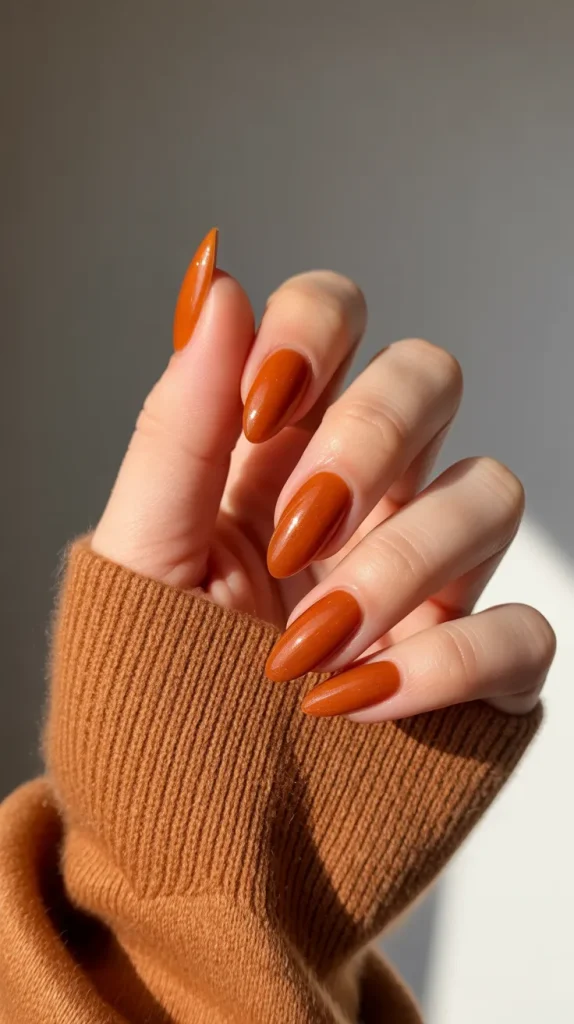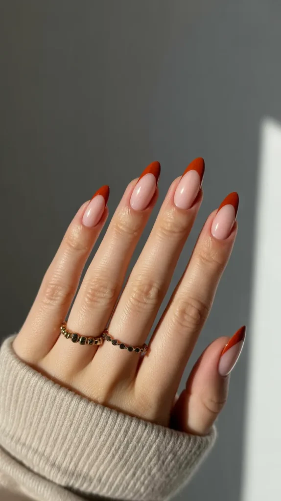 Take the timeless French mani and swap the white for rust-orange tips. This little tweak transforms the look into something perfectly seasonal yet classy. It’s subtle enough for work but still gives you that almond nails for autumn vibe.