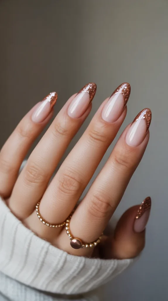 Who says fall nails can’t sparkle? Beige almond nails topped with copper glitter tips add just enough shine without looking like holiday overload. They balance cozy and festive in the most classy nail way possible.
