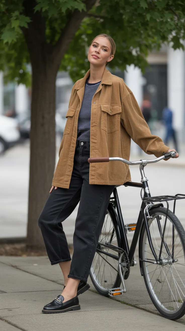 This outfit is a perfect blend of cozy fashion and effortless style. The corduroy jacket brings warmth and texture, making it a staple for autumn outfits. Its rich, earthy tone complements the classic striped tee underneath, adding a playful touch to the layered look.