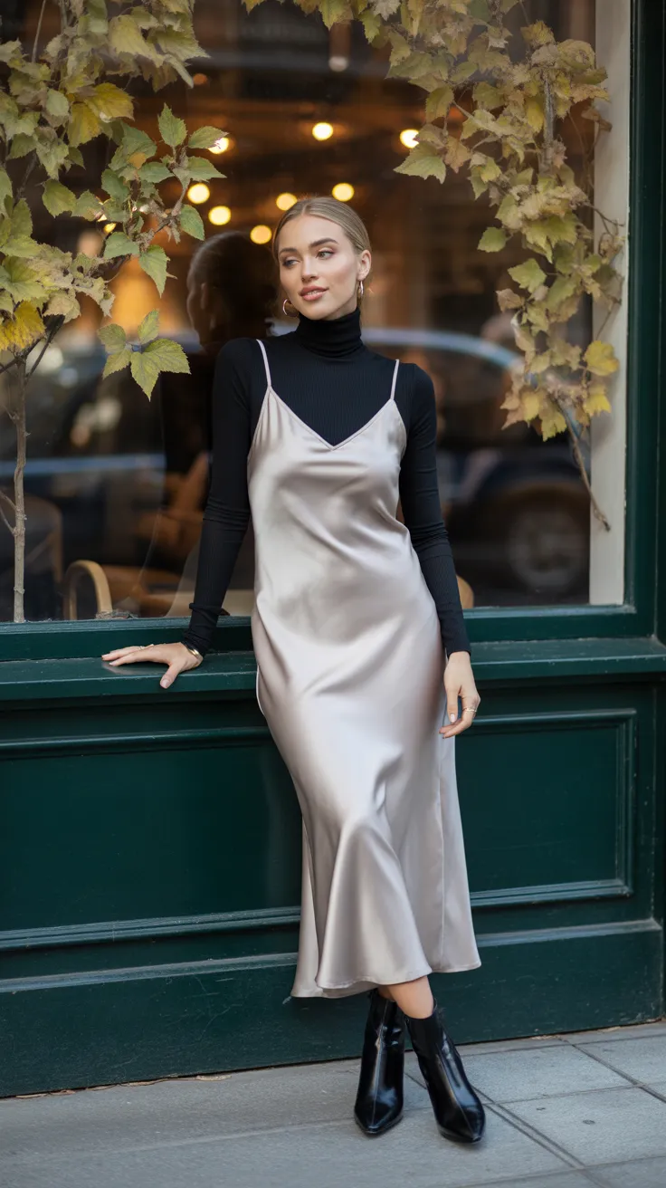 The model showcases a sleek, satin slip dress in a warm, earthy tone, paired with a fitted turtleneck. This layered look not only adds warmth but also creates a chic silhouette. The combination of textures adds depth to the outfit, making it visually appealing.