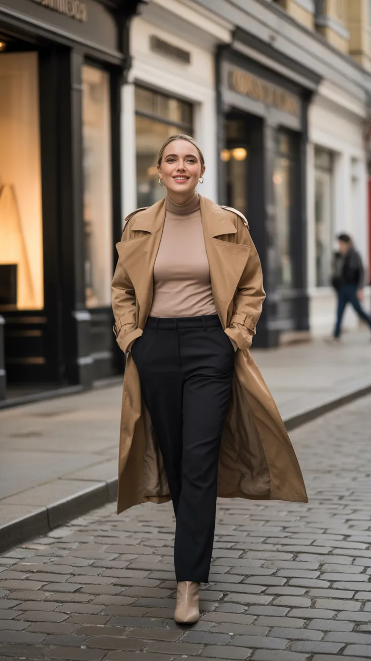 The trench coat adds a polished touch, while the turtleneck keeps you snug. Opt for a neutral trench, like camel or beige, to match with various outfits. Underneath, a fitted turtleneck in a soft fabric can be both stylish and comfortable.