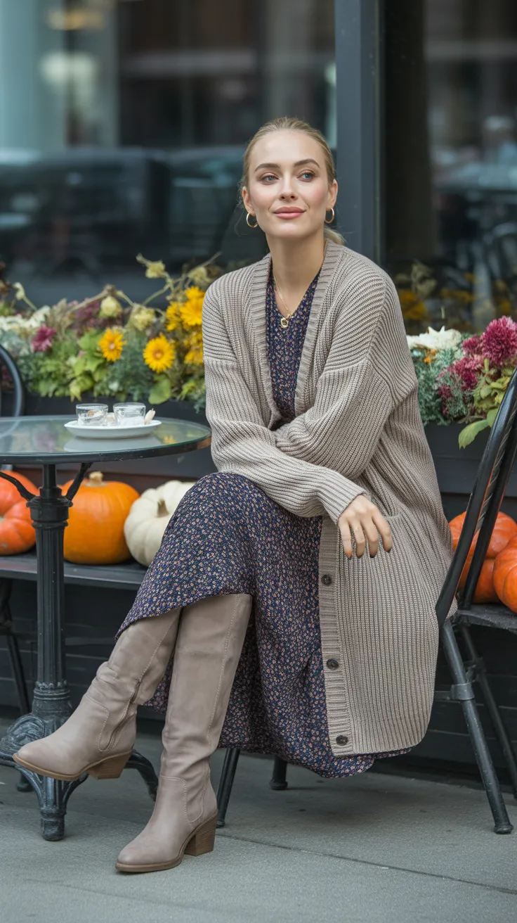 The combination of a cozy cardigan and a lovely midi dress is a perfect choice for fall. This layered look brings warmth while keeping things stylish. The rich colors of autumn are beautifully represented in this outfit, making it ideal for seasonal style.