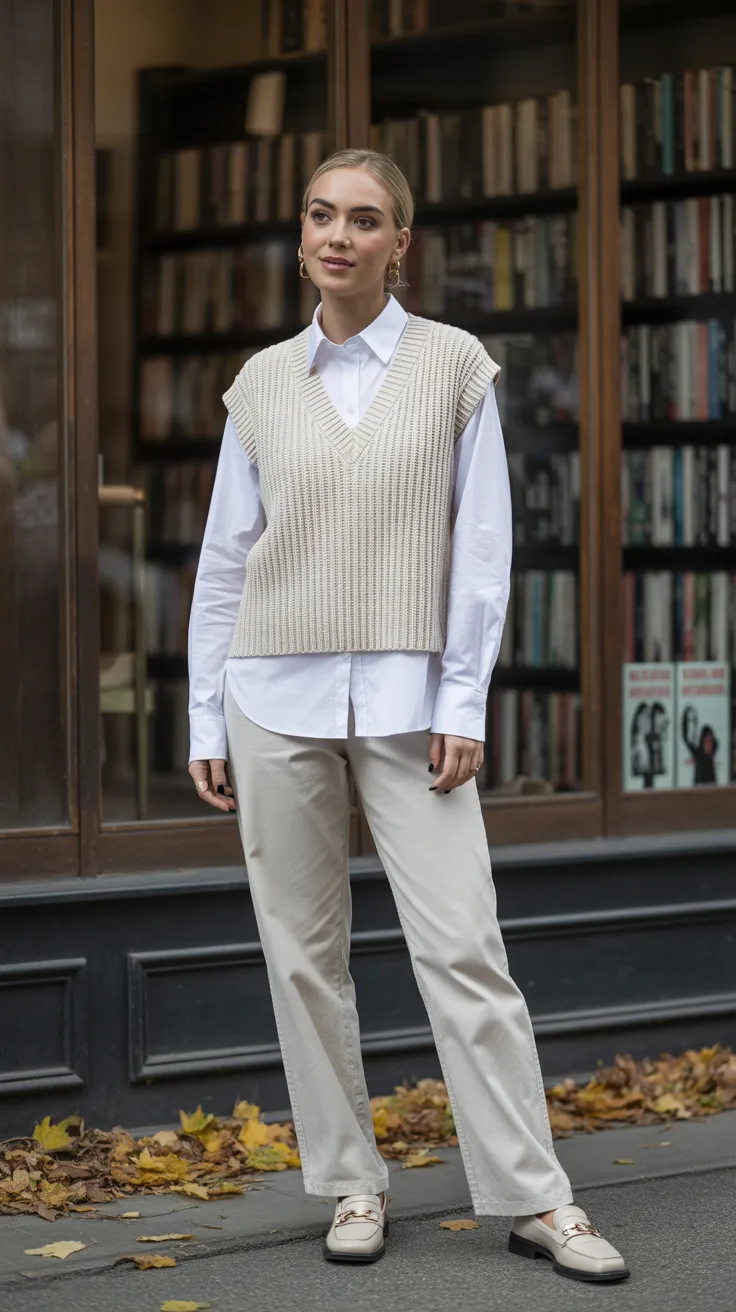 In the image, the model showcases a light-colored knit vest over a crisp white button-up shirt. This combination not only looks chic but also offers versatility. You can easily dress it up with tailored pants or keep it casual with jeans. The neutral tones are ideal for seasonal style, allowing you to mix and match with various bottoms.