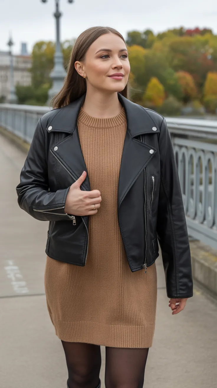The combination of a leather jacket and a sweater dress is a perfect match for cozy fashion this fall. The leather jacket adds an edgy touch, while the sweater dress keeps things warm and comfy. This layered look is ideal for those crisp autumn days when you want to feel stylish without sacrificing comfort.
