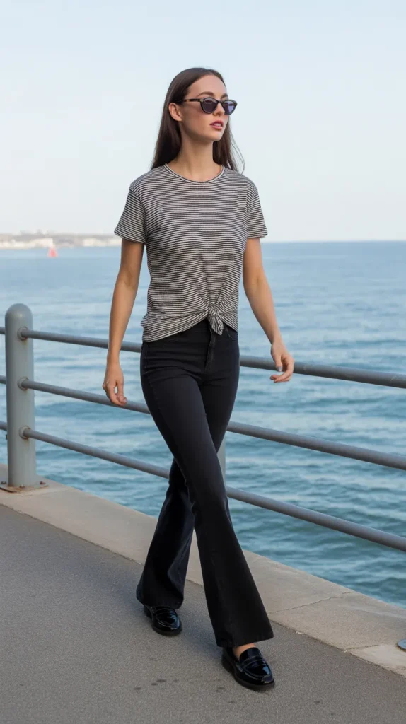Stripes make everything feel more polished. Tuck a navy striped tee into your flare leggings, add loafers, and finish with oversized sunglasses for casual chic perfection. It’s got that nautical-meets-modern twist that works year-round. One of those everyday outfits that feels effortless but totally intentional.