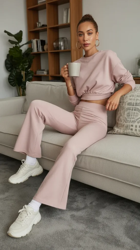 Cozy casual at its finest. Pair your flares with a cropped sweatshirt, chunky sneakers, and hoop earrings. It’s the kind of everyday outfit you’ll wear over and over. It feels playful but still stylish, perfect for campus days, errands, or casual hangouts. If leggings are comfort clothing, cropped sweatshirts are their soulmate.