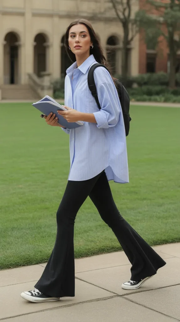 Playful yet chic, this look pairs flare leggings with a light blue oversized button-up shirt styled like a dress. Sneakers and a mini backpack keep it casual and young. It’s one of those cute outfits that feels fresh and fun, perfect for weekend hangs or spontaneous adventures.