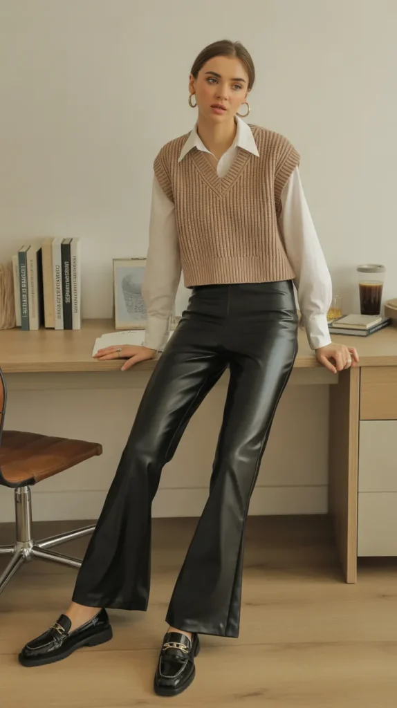 Trendy and polished, this outfit layers a cropped sweater vest over a fitted shirt with flare leggings. Add loafers and hoop earrings for a chic preppy twist. It’s giving school-girl-meets-modern vibes in the best way. Perfect for casual office days or weekend outings where you want to look playful but still sharp.